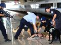 8月1日,武汉铁路公安局特警队员在进行登车演练。当日,武汉铁路警方在武汉火车站开展保暑运反劫持安全演练,实景模拟动车组突发劫持后,警方开展一系列的谈判、抓捕、疏散等处置措施。