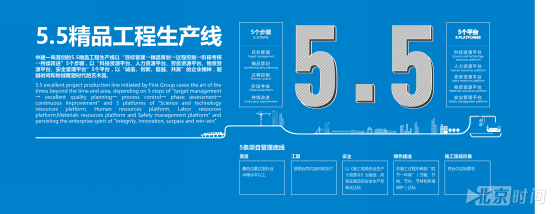 “5.5精品工程生产线”包括5个步骤、5个平台、5条底线。5个步骤,即“目标管理→精品策划→过程控制→阶段考核→持续改进”,就是在建筑产品生产现场的PDCAS循环,以此实现全面质量管控,确保全过程每个环节都是精品后再交给下一个工序。5个平台,即“科技、人力资源、劳务、物资及安全平台”,就是指局、子企业两级总部,为工程生产提供全方位的资源要素支撑,以此实现智慧建造、绿色建造、安全建造、节约建造。5条管理底线,即最低也要达到行业中等水平以上的质量底线、按照合同时间交付使用的工期底线、必须达标的安全底线、必须做到“四节一环保”(节能、节地、节水、节材和环境保护)达标的绿色建造底线、必须达标的施工现场形象管理底线。这5条管理底线是质量管理的红线和高压线,不可触碰、不可逾越。
