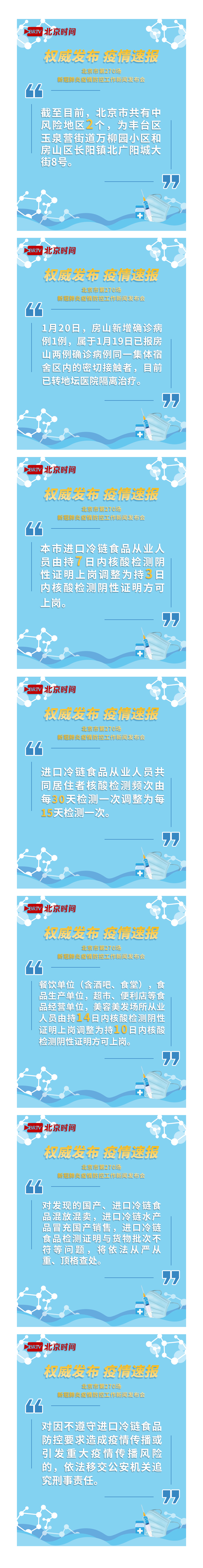 1月20日,北京市召开新型冠状病毒肺炎疫情防控工作第270场新闻发布会。发布会通报,1月20日0时至16时,北京新增5例本土新冠肺炎确诊病例,在丰台区和房山区,其中3例为昨日通报的核酸检测阳性者诊断为确诊病例,普通型2例,轻型1例。会上还发布了风险等级调整、冷链等行业要求变化等信息。戳图,北京疫情最新发布划重点来了!