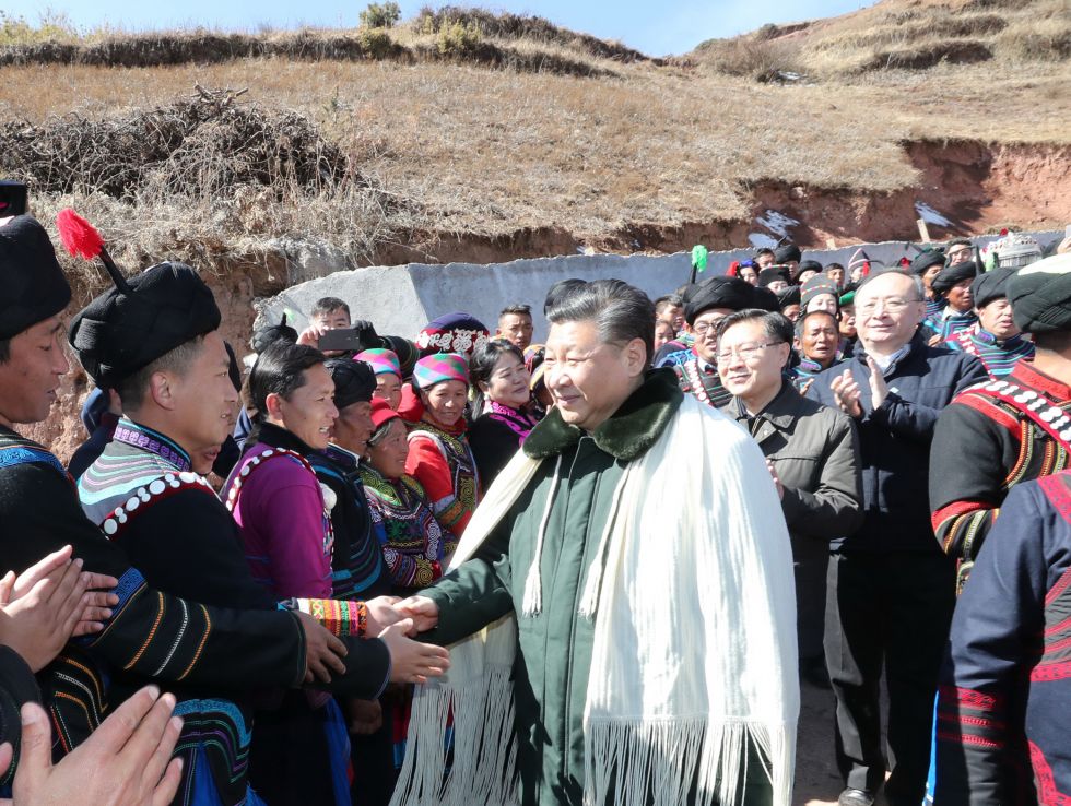 ↑2018年2月11日上午,习近平在凉山彝族自治州昭觉县解放乡易地扶贫搬迁新村火普村同乡亲们亲切握手。
