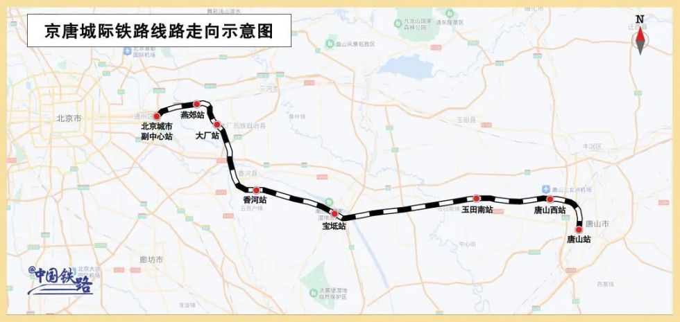 京唐城际铁路全线共设置北京城市副中心、燕郊、大厂、香河、宝坻、玉田南、唐山西、唐山8座车站,其中燕郊站和唐山站为既有车站。