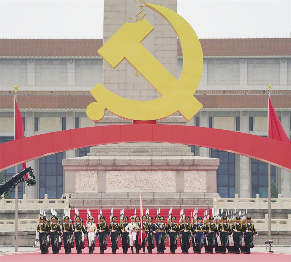 2021年7月1日,庆祝中国共产党成立100周年大会隆重举行,天安门广场上空,一面鲜红的中国共产党党旗由直升机护旗梯队护卫,迎风向前。