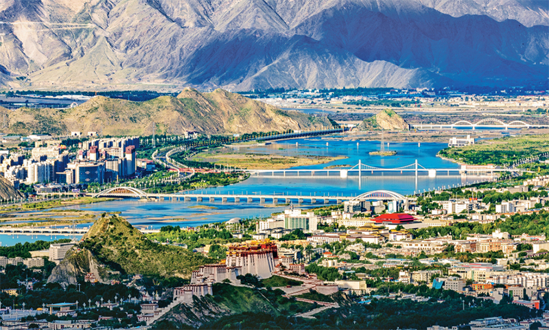 西藏自治区成立60年来,社会生产力获得极大解放和发展,社会面貌发生翻天覆地的变化。图为2025年7月30日拍摄的拉萨河风光,河上的桥由近及远分别是连心桥、柳梧大桥、和美桥、青藏铁路拉萨河特大桥,这些桥梁方便了人们的生活,扮靓了城市的风景,也是西藏经济社会发展、交通基础设施建设日新月异的侧影。 新华社记者 姜帆/摄