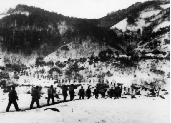 志愿军第27军跨过冰天雪地的北部山区,向南朝鲜长津湖地区前进。