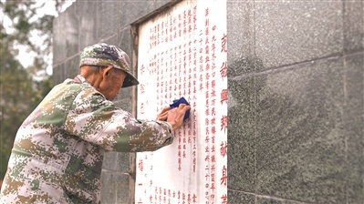 缅怀烈士活动结束后,覃国省搀扶着莫兆明,围着烈士陵园走了一圈,请莫兆明给他讲述更多关于烈士的故事。“家里有叔公这样的烈士,我感到很骄傲。”覃国省说,“很感谢莫老,在我们没有找到叔公的几十年里,一直默默守护着他。”