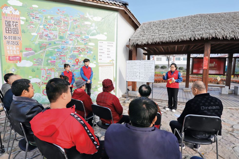 国网青岛供电公司“电力彩虹”宣讲团成员在青岛市即墨区“莲花田园”乡村振兴示范片区为村民宣讲党的二十大精神。国网青岛供电公司供图