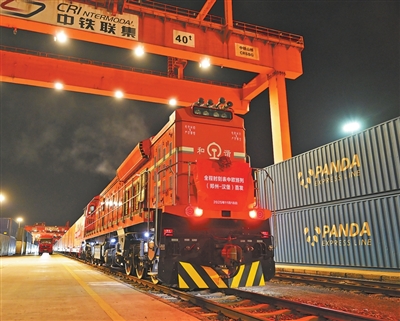 河南郑州,首趟全程时刻表中欧班列X8003次列车满载新能源汽车等货物从中国铁路郑州局集团有限公司圃田站启程,发往德国汉堡。