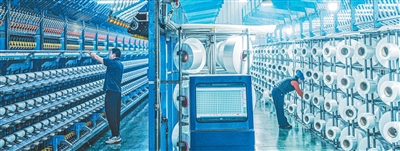 江苏宿迁宿城区龙河镇世成纺织科技有限公司生产车间里,工人在智能化生产线上工作。