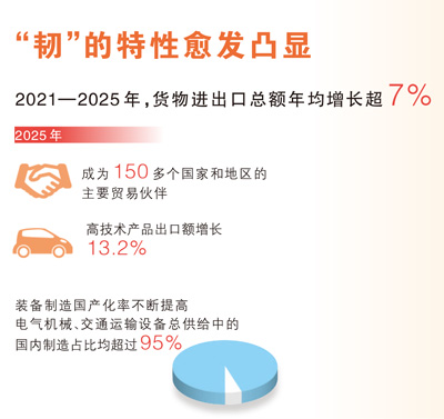 看顶压前行的韧性。2025年,规模以上高技术制造业增加值占规模以上工业增加值比重升至17.1%,最终消费支出对经济增长贡献率达52%;全国统一大市场建设纵深推进,综合整治“内卷式”竞争成效显现;养老、育幼、医疗等民生事业取得积极进展。我国经济发展中老问题、新挑战仍然不少,我们迎难而上、砥砺前行,实现了“量的跨越”与“质的提升”。