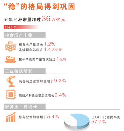 看稳中有进的态势。2025年,GDP跨越140万亿元关口,比上年增长5.0%;粮食产量连续两年站稳在1.4万亿斤的台阶;制造业规模有望连续16年保持全球第一;货物贸易再创新高……经济稳中向好势头不断巩固拓展,构筑起中国经济行稳致远的坚实底气。