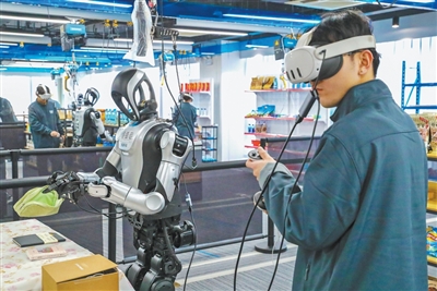 山东青岛人形机器人数据采集训练场,数据采集人员通过设备指导人形机器人学习抓取、搬运与分拣等技能。