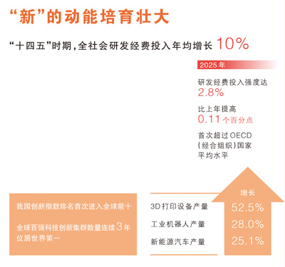 看向新向优的活力。科技与产业深度融合,创新成果竞相涌现,我们依靠创新为高质量发展赋能。2025年,我国在人工智能、量子科技、脑机接口等前沿领域捷报频传;规模以上数字产品制造业增加值比上年增长9.3%,新能源汽车国内新车销量占比超过50%。创新创造催生了新质生产力,让中国经济向新而行、充满活力。