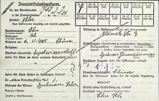 朱德在德国哥廷根大学填写的“大学录取登记卡”
