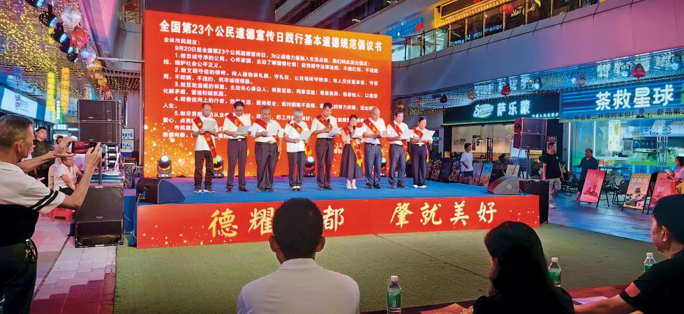 “德耀砚都 肇就美好”——2025年“公民道德宣传日”暨肇庆文明夜市活动在端州区星湖一方新时代文明实践点举行。图为肇庆市好人模范倡议践行公民道德规范。莫学松摄