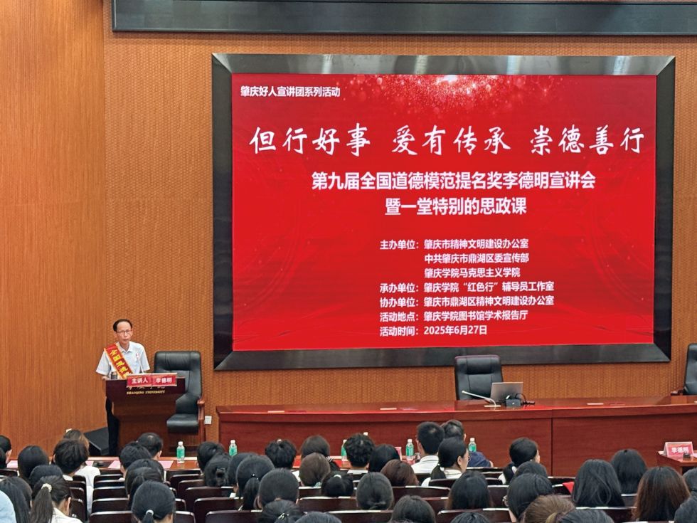 “但行好事 爱有传承 崇德善行”第九届全国道德模范提名奖李德明宣讲会暨一堂特别的思政课在肇庆学院举行,众多学生聆听模范故事,感悟榜样力量。黄艳敏摄