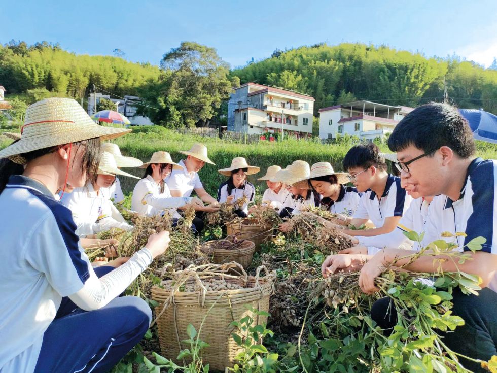 肇庆市将新时代文明实践与育人相结合,定期组织大中专学生开展志愿服务活动。图为肇庆学院的大学生志愿者在肇庆市封开县大洲镇泗科村帮助农民采收花生。莫伟龙摄