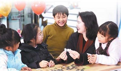 四川省乐山市市中区海棠街道桂花楼社区,流动党员(右二)参与社区寒假公益托管班志愿服务。