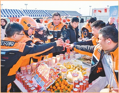 “师傅,喝杯热水暖暖身子!”春节前夕,陕西省咸阳市秦都区古渡街道瑞士城“骑士驿站”总站里暖意融融。外卖骑手何昭辉把车一停,摘下沾着寒气的头盔。