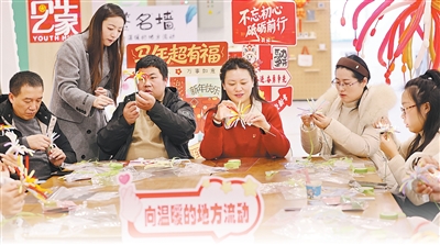 江苏省连云港市连云区组织流动党员开展春节主题系列活动,图为流动党员在体验制作扭扭棒烟花束。