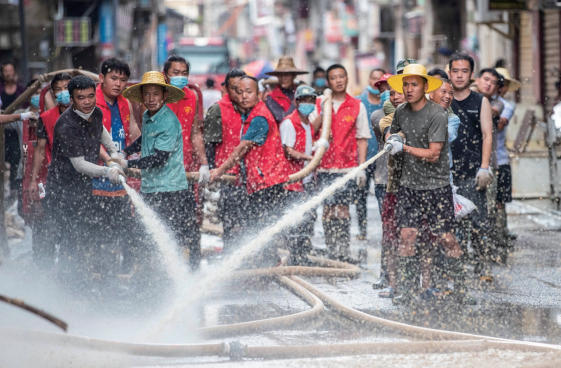 2025年6月30日,在贵州省从江县丙梅街道俞家湾社区,党员干部和志愿者在合力清淤。自从江县发生洪涝灾害以来,当地广大党员发挥先锋模范作用,积极投入抢险救灾工作,帮助群众尽快恢复正常的生产生活秩序。